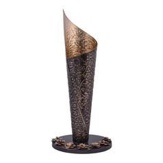 This is a handmade metal vase that is colored black and features a flower pattern. The vase is likely made of a durable metal, such as iron or steel, and has been crafted by hand to create a unique and individualized piece.